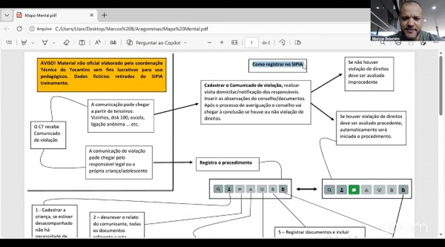 No terceiro e último dia, Marcos Benjamin apresentou um mapa mental, reforçando novamente o passo a passo para a correta alimentação do sistema, conforme a comunicação de violação de direitos da criança e do adolescente. Ele explicou que essas comunicações podem ser feitas por vizinhos, pelo Disque 100, pela escola, por ligação anônima, pelo responsável legal ou pela própria vítima. “A partir da comunicação de violação de direitos, o conselheiro deve averiguar a situação e, sendo procedente, o sistema é acionado automaticamente”, explicou.